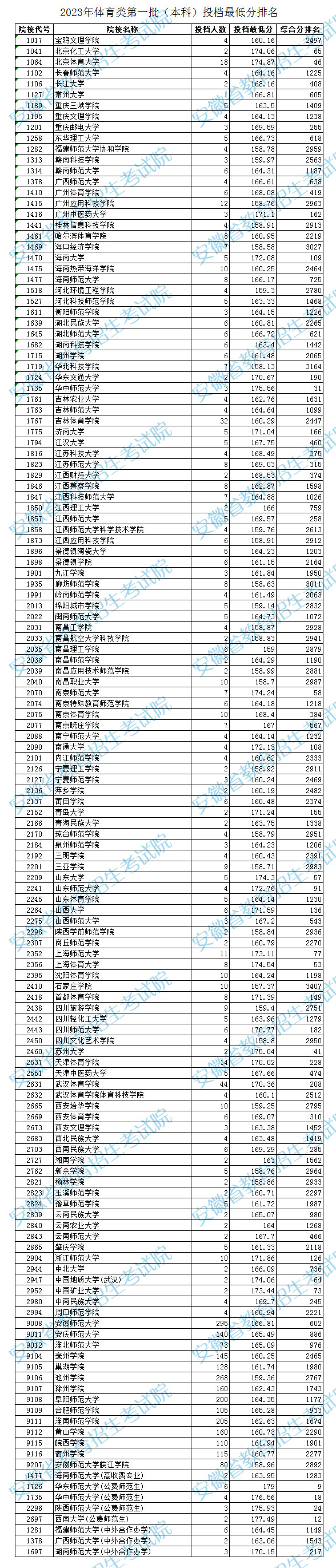 安徽省2023年体育类第一批(本科)投档最低分排名