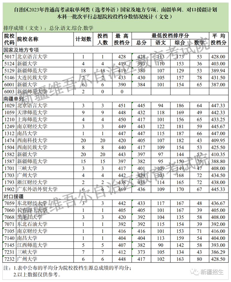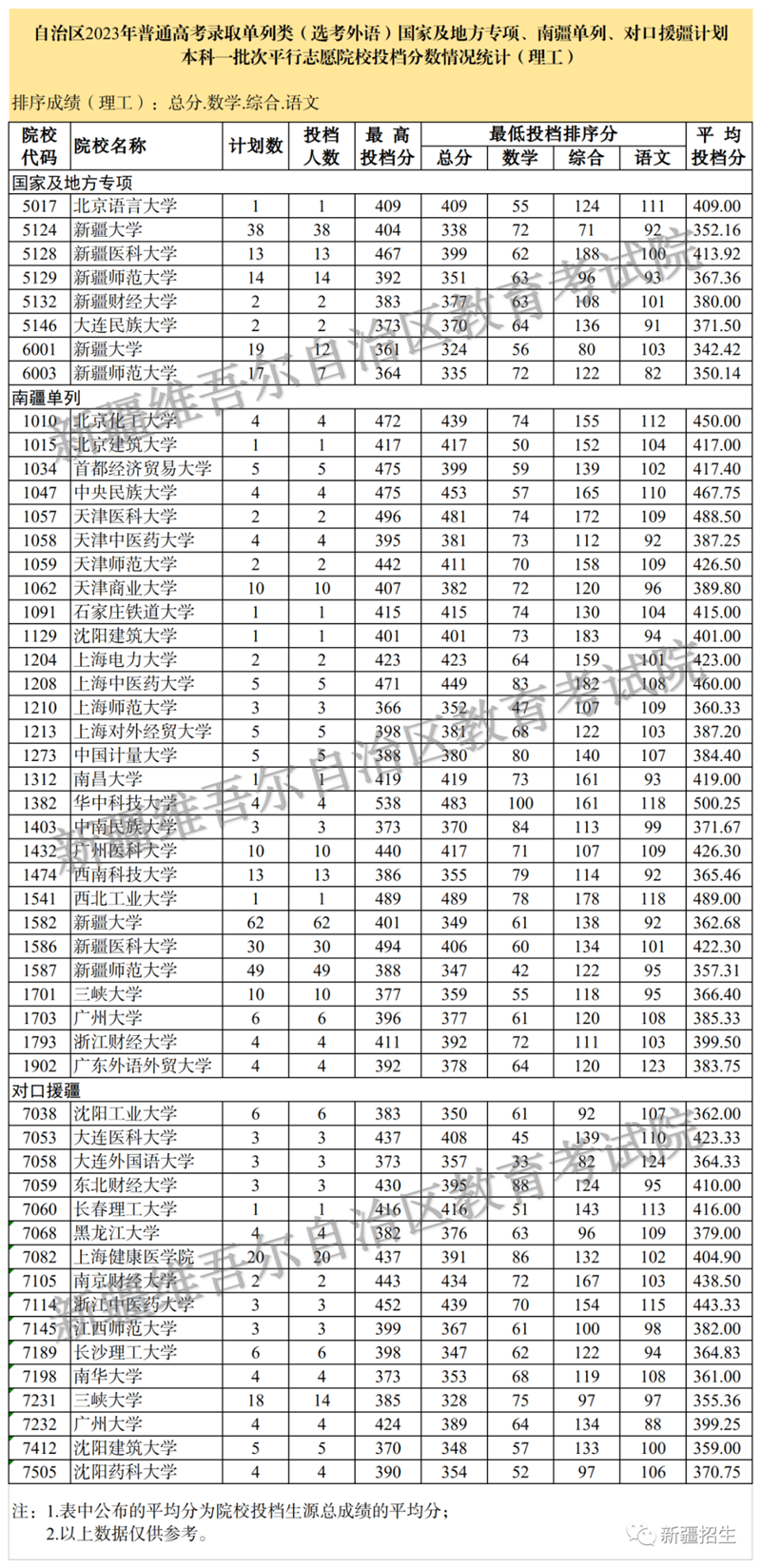 按照录取工作安排,我区普通高校招生国家及地方专项、南疆单列、对口援疆计划本科一批次投档录取工作7月16日已开始,录取现场工作组根据投档原则对国家及地方专项、南疆单列、对口援疆计划本科一批次单列类(选考外语)考生在我区录取院校进行了投档,并通知相关院校及时接档、阅档,要求其按照录取原则及招生章程进行录取。目前,各录取环节工作有序进行,现将各院校投档情况公布如下。