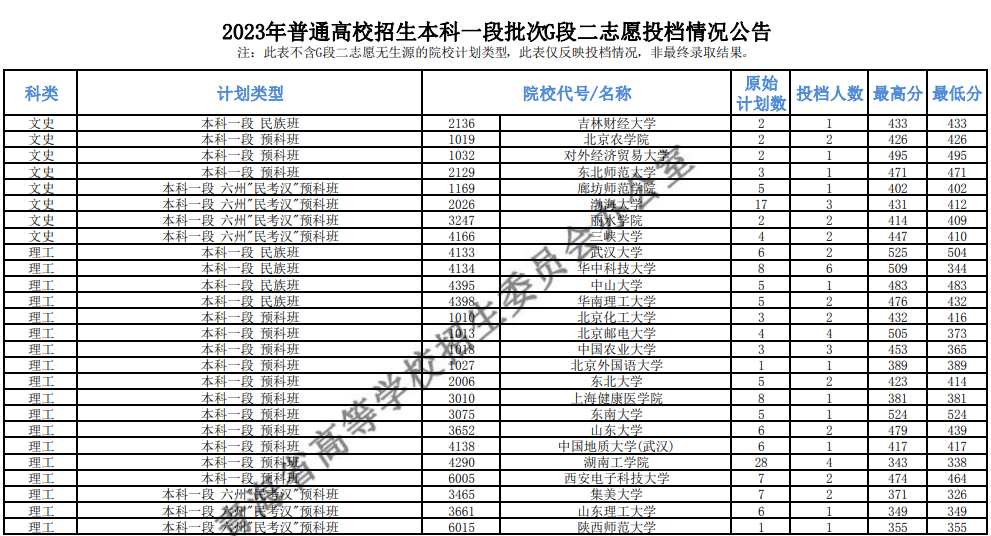 青海2023普通高校招生本科一段批次G段二志愿投档情况公告