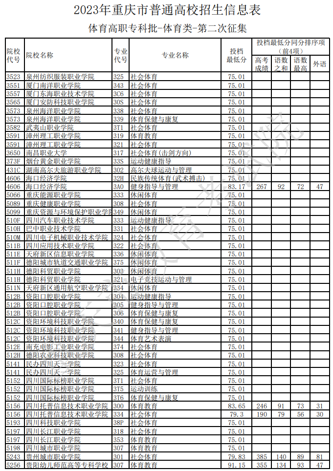 2023重庆普通高校招生信息表-体育高职专科批-体育类-第二次征集