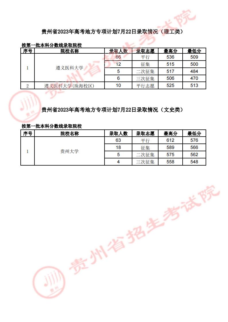 贵州省2023年高考地方专项7月22日录取情况