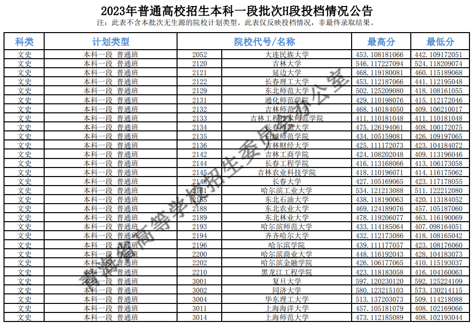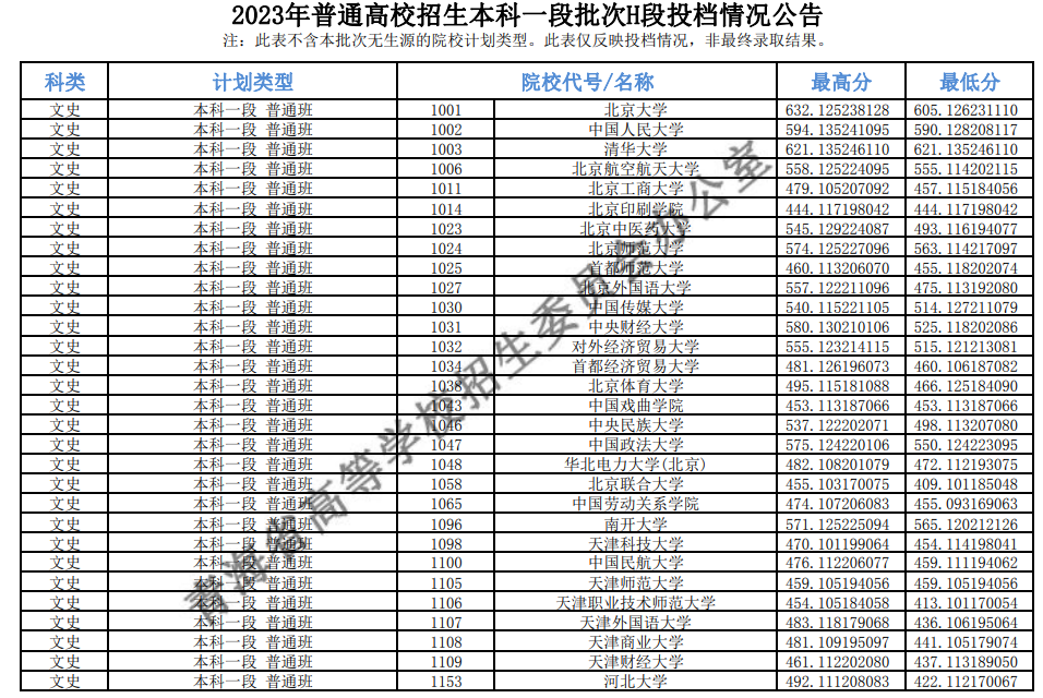 青海2023年普通高校招生本科一段批次H段投档情况公告