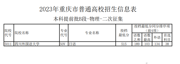 2023年重庆市普通高校招生信息表-本科提前批B段-物理-二次征集