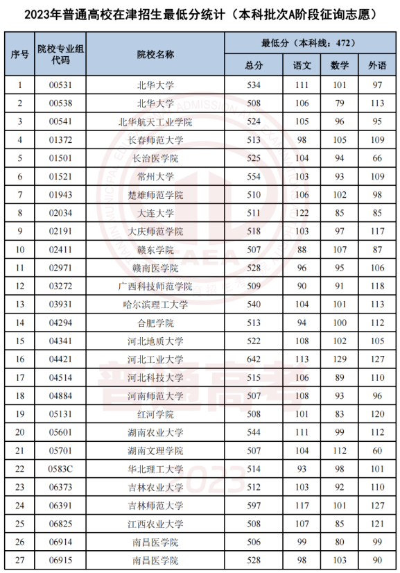 天津市2023年普通高校招生本科批次A阶段征询志愿、艺术类本科批次征询志愿及体育类本科批次征询志愿录取工作已结束。7月25日15时起,考生可以通过登录招生院校网站、招考资讯网(www.zhaokao.net)、微信小程序“天津招考”、全国一体化在线政务服务平台、津心办APP、津云客户端、中国建设银行APP等多种途径查询征询志愿的录取结果。现将征询志愿最低分统计公布如下: