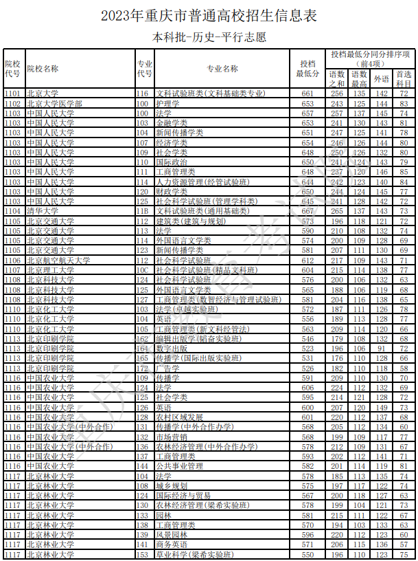 2023年重庆市普通高校招生信息表-本科批-历史-平行志愿
