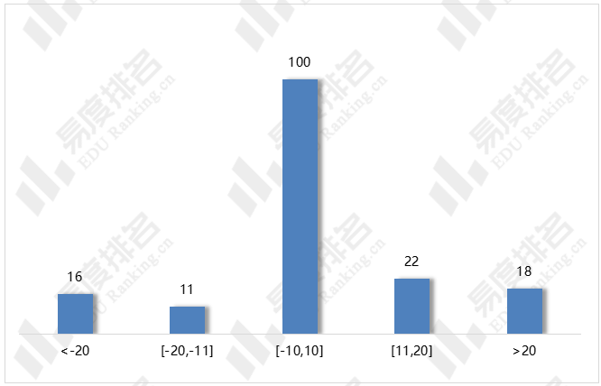 下图展示了宁夏2023年文科普通本科一批院校投档最低分与上一年度同位分差值的直方图,差值为负代表院校2023年的投档位次有所下降,反之则代表院校的投档位次有所上升。可以看出60%的院校与上一年度的同位分差在10分以内,约24%的院校投档同位分涨幅超过10分,位次上涨的多于位次下降的。