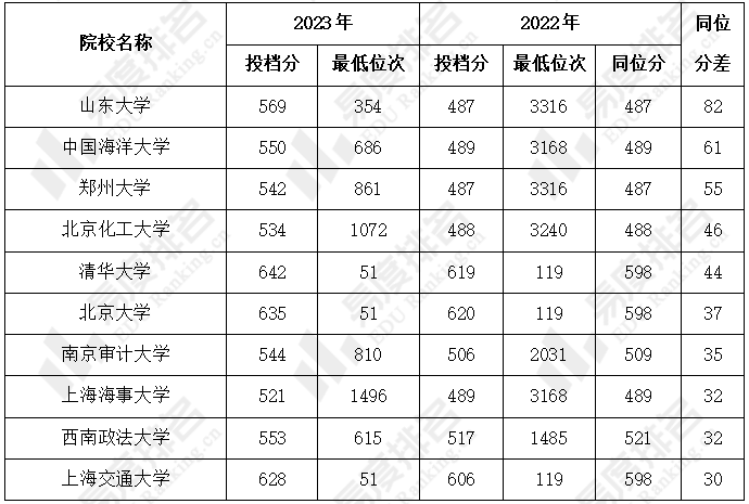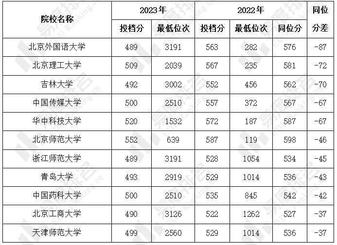 下表展示了投档最低位次上涨较多的院校投档信息,以下均为重点及以上院校。