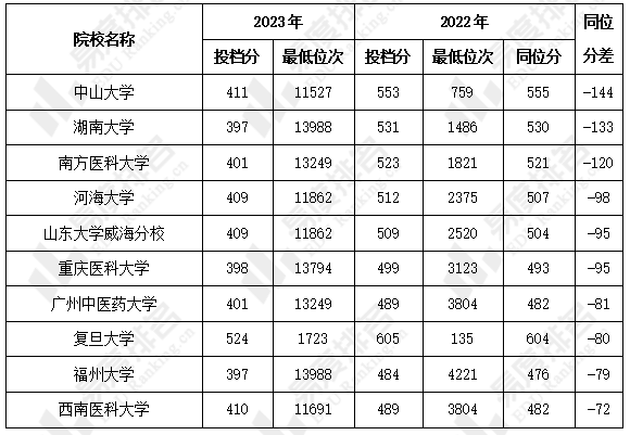 下表展示了投档最低位次上涨较多的院校投档信息,以下均为重点及以上院校。