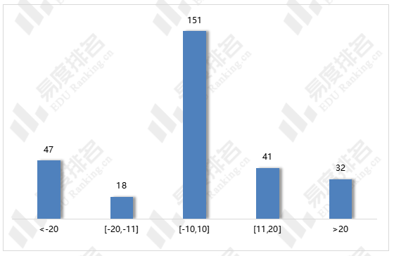 下图展示了宁夏2023年理科普通本科一批院校投档最低分与上一年度同位分差值的直方图,差值为负代表院校2023年的投档位次有所下降,反之则代表院校的投档位次有所上升。可以看出52%的院校与上一年度的同位分差在10分以内,25%的院校投档同位分涨幅超过10分,位次上涨的略多于位次下降的。