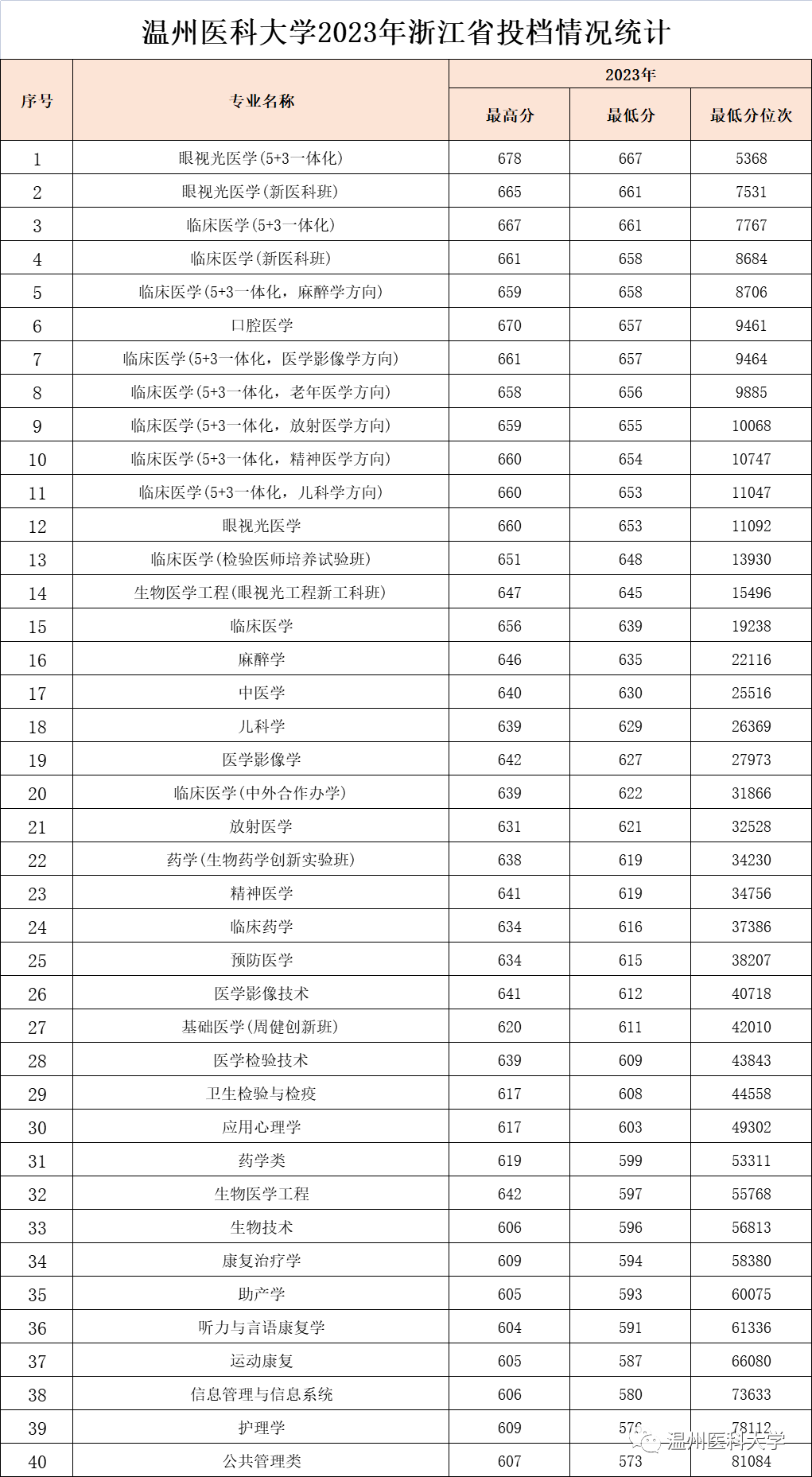 7月19日,浙江省2023年普通高校招生普通类平行投档(一段)分数线公布,温州医科大学生源质量稳中有升。省属院校专业投档线前十专业8个,投档线在1万名以内专业8个,录取万名以内人数再次位居省属高校第一。眼视光医学(5+3一体化)超出特殊类型招生控制线73分,连续7年在省属院校所有专业中位列第一;最高录取分678分,位次2525。