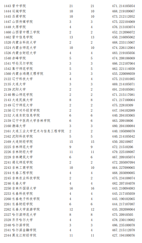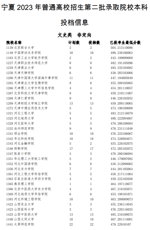 宁夏2023年普通高校招生第二批录取院校本科投档信息
