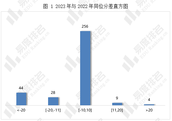 下图展示了安徽2023年文科普通本科一批院校投档最低分与上一年度同位分差值的直方图,差值为负代表院校2023年的投档位次有所下降,反之则代表院校的投档位次有所上升。可以看出75%的院校与上一年度的同位分差在10分以内,21%的院校投档同位分降幅超过10分。