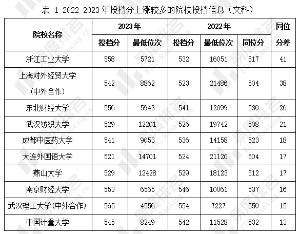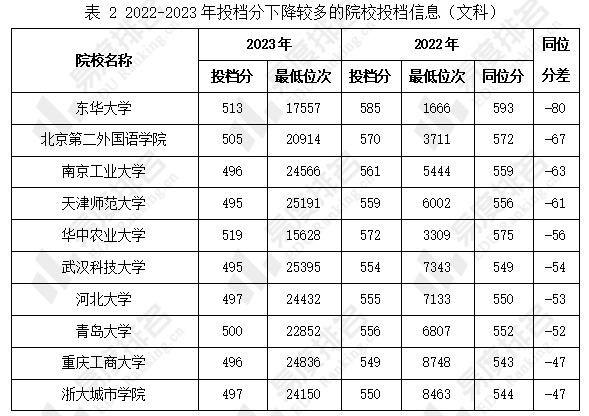 下表展示了投档最低位次上涨较多的院校投档信息,以下院校多为重点院校。
