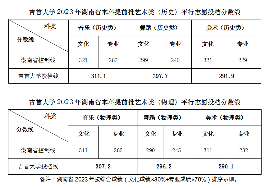 吉首大学2023年湖南省本科提前批艺术类平行志愿投档分数线