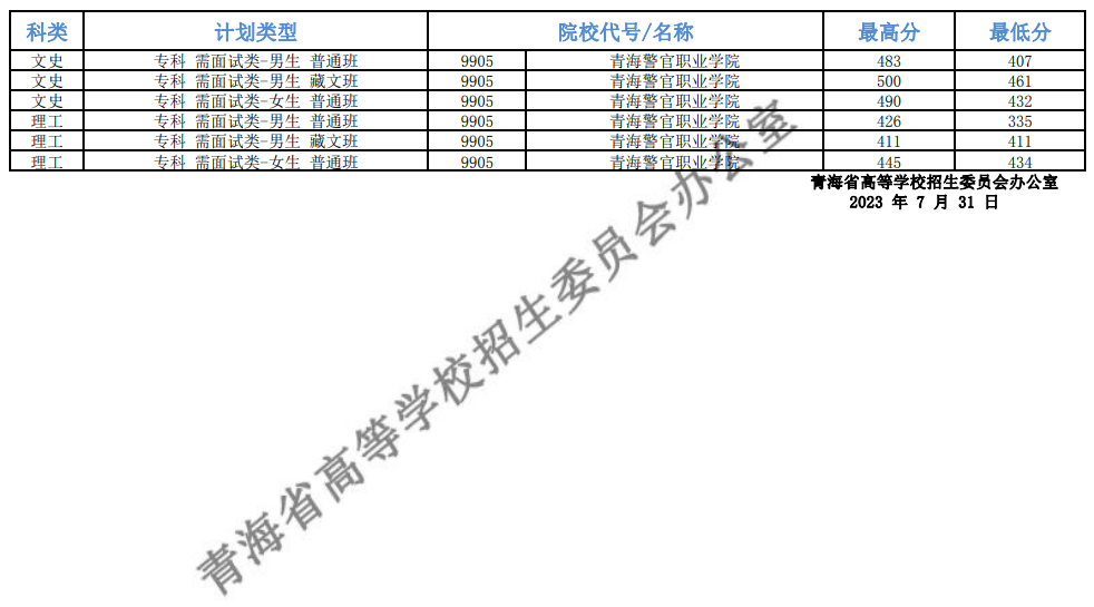 青海2023年普通高校招生省内公安专业批次N段投档情况公告