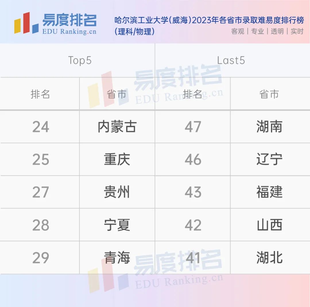 对比哈工大的三个校区在各省市的理科/物理方向报考难度,深圳校区因为优越的地理位置,整体都超过了本部。深圳校区的排名全部在20名以内;贵州、宁夏等偏远