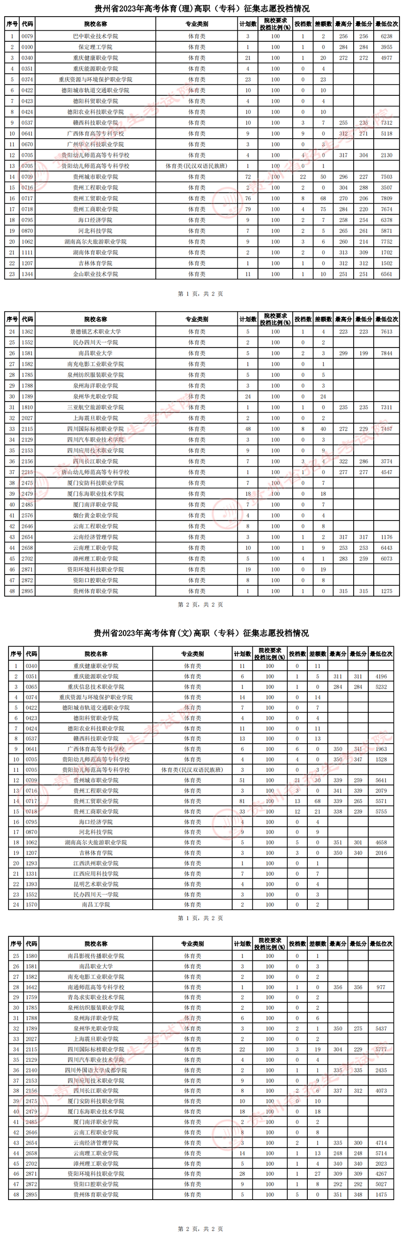 贵州省2023年高考体育类高职(专科)征集志愿投档情况