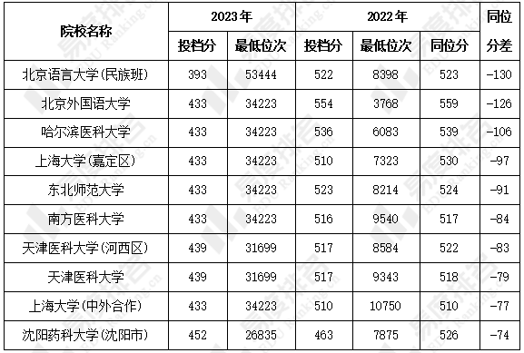 下表展示了投档最低位次上涨较多的院校投档信息,以下均为重点及以上院校,且分数涨幅均超过30分。