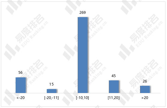 下图展示了甘肃2023年理科普通本科一批院校投档最低分与上一年度同位分差值的直方图,差值为负代表院校2023年的投档位次有所下降,反之则代表院校的投档位次有所上升。可以看出65%的院校与上一年度的同位分差在10分以内。