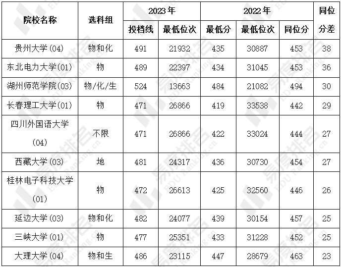 下表展示了投档最低位次上涨较多的院校-专业组投档信息,2023年投档同位分上涨幅度相对较小。
