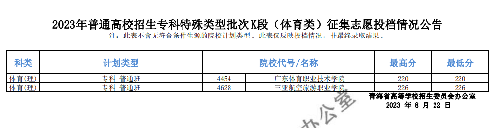 青海2023年普通高校招生专科特殊类型批次K段(体育类)征集志愿投档情况公告