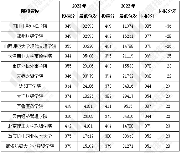 表 1 2022-2023年投档分波动较大的院校投档信息(理科)
