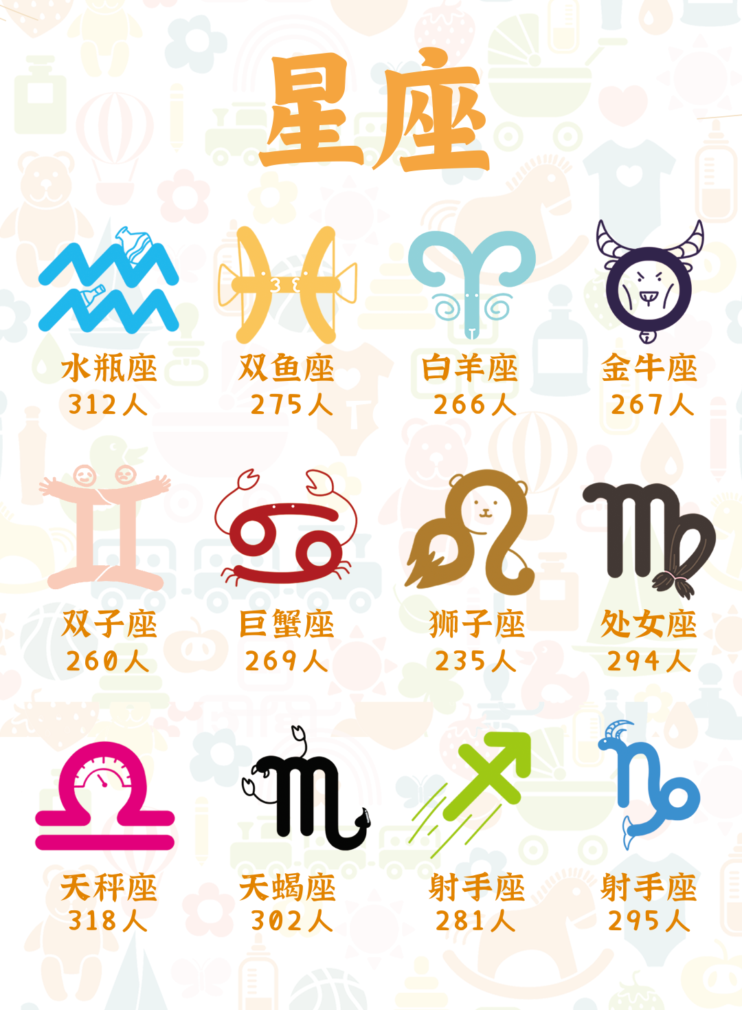 在2023级的新生大家庭里,位居榜首的是公平和谐的天秤座,有318人,占总人数的9.4%,最少的是自信洋溢的狮子座,有235人,占总人数的7.0%,在潍医,你们都是璀璨的星星。生肖更是大有不同,生肖鸡的萌新们的人数拔得头筹,占总人数的56.7%,快看看你的同学星座生肖是什么吧!