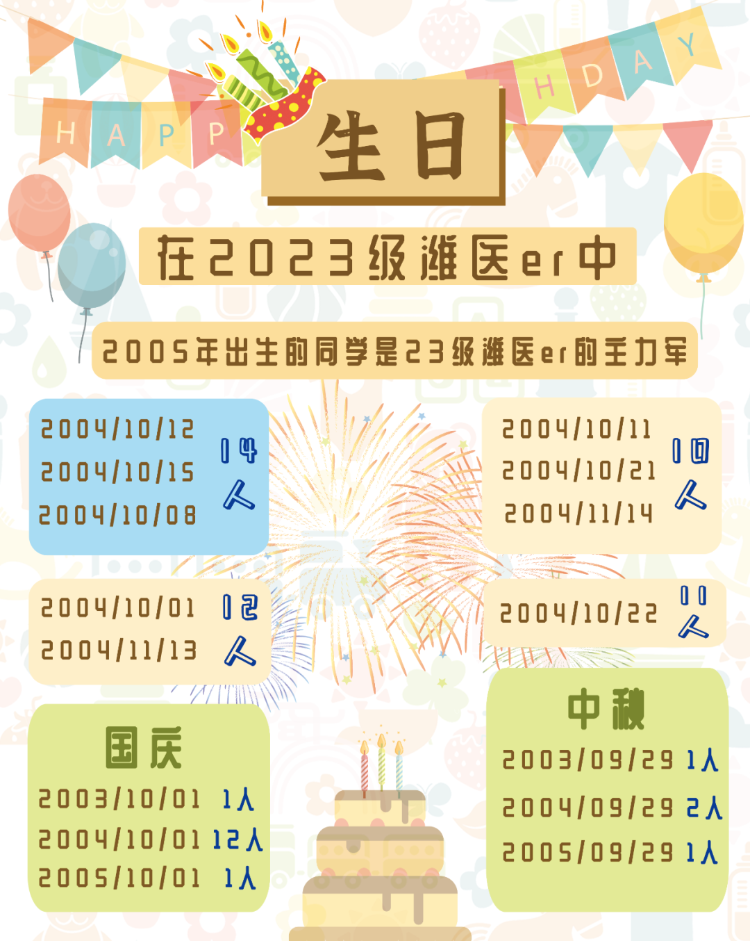 2005年出生的2023级潍医er是主力军,高达1913人,占总数的56.7%。出生于2004年10月8日、2004年10月12日、2004年10月15日各有14位同学。有9位同学,就在8月27日报到当天迎来了自己的生日,小潍送来祝福!