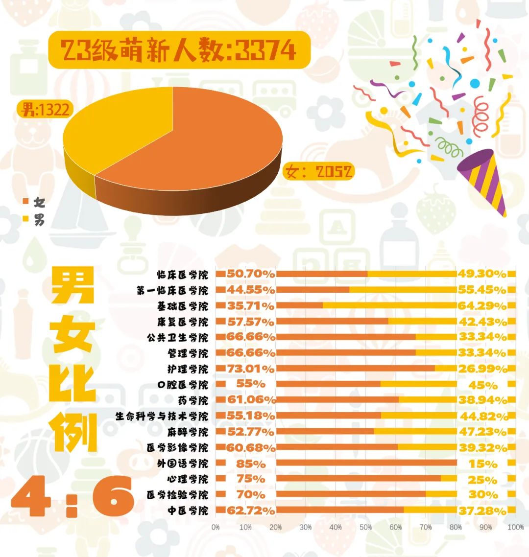 2023级共有3374名潍医人(含第二学士学位),1322名男生,2052名女生,男女整体比例为4:6。哪个专业男女比例平分秋色?当属