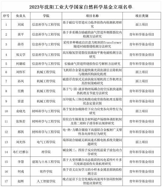 8月24日,2023年度国家自然科学基金面上和青年项目评审结果揭晓,沈阳工业大学共有17个项目获国家自然科学基金委立项资助,其中面上项目5项,青年基金项目12项。部分非集中接收国家自然科学基金项目正在申报评审中。国家自然科学基金是衡量高校科学研究水平的重要指标。近年来,学校高度重视科学研究和科技创新工作,加大力度做好国家科学基金项目的申报和管理工作,通过统筹谋划、积极动员和精准辅导等系列举措,切实提高申报项目质量,学校承担国家重大科技任务的能力不断提升。下一步,学校将进一步完善国家级科研项目培育机制,优化科技创新激励机制,加大国家级科研项目培育力度,不断提升学校科技创新实力,充分发挥国家自然科学基金在提升基础研究水平、人才培育与团队建设、学科建设和促进重大成果产出等方面的重要支撑和引领作用。
