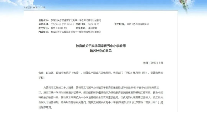 为贯彻落实党的二十大精神和习近平总书记关于教育的重要论述特别是关于教师队伍建设的重要指示批示精神,按照《中共中央国务院关于全面深化新时代教师队伍建设改革的意见》要求,对标2035年建成教育强国目标,加强高素质中小学教师培养,深入实施科教兴国战略,夯实创新人才培养基础,近日,教育部印发《教育部关于实施国家优秀中小学教师培养计划的意见》(以下简称“国优计划”《意见》)。