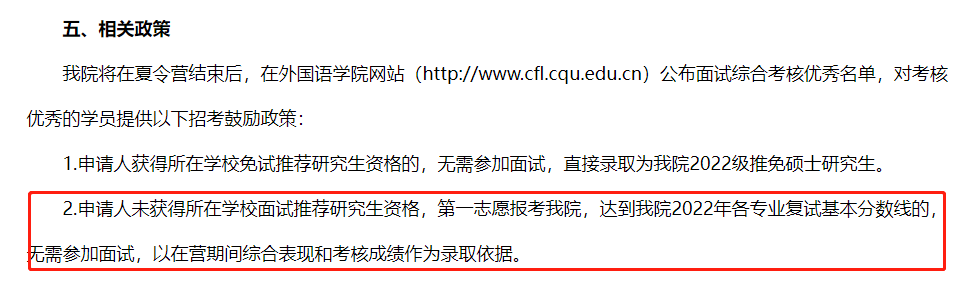 其外国语学院营员政策为:申请者未获得所在学校免试推荐研究生资格,第一志愿报考我院时,达到我院公布的2024年各专业复试基本分数线(含总分、单科分数)标准,无需参加复试,以在营期间综合表现和考核成绩作为我院2024级硕士研究生录取依据。
