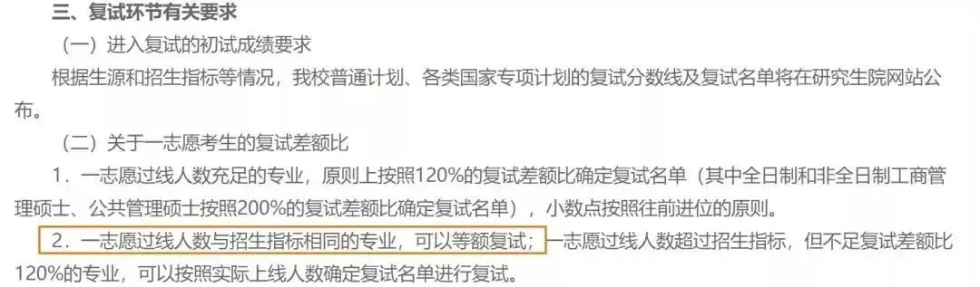 一志愿过线人数与招生指标相同的专业,可以等额复试。