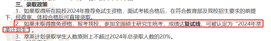 24萃英计划中的录取政策也表明:如果未取得推免资格,报考我校,参加全国硕士研究生统考,成绩达复试线,可被认定为“2024年萃英计划生”。