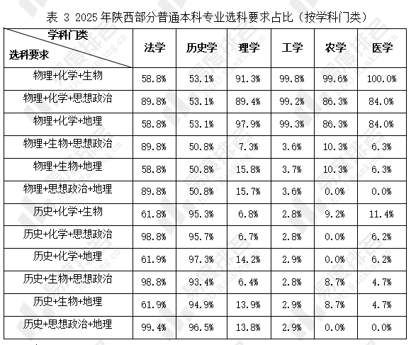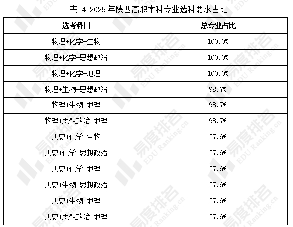 2025年在陕西招生的高职本科专业有151个,选考物理科目的考生可报考专业占比达98%以上,而选考历史科目的考生可报考专业占比仅57%。因高职本科专业中