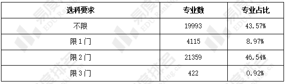2025年在河南招生的本科专业有45889个,超56%的专业有选科要求,其中限2门选科的专业最多,占所有专业的46.54%,限2门科目的专业中物理+