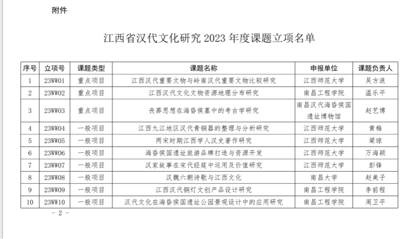 近日,江西省文化与旅游厅公布2023年度江西省汉代文化研究课题立项名单。我校江西省汉代文化研究基地获批3项课题,其中重点课题1项、一般课题2项,资助经费共计6万元。