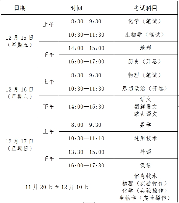 2023年下半年吉林省普通高中学业水平合格性考试日程表: