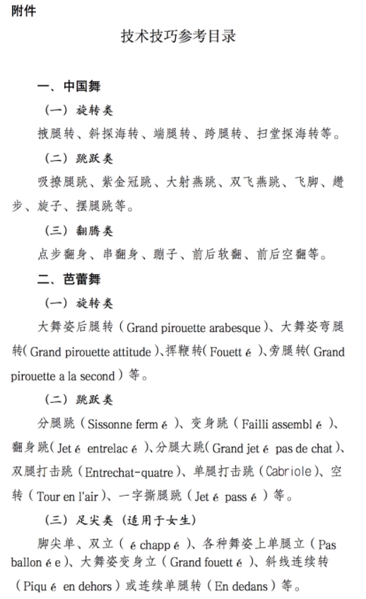 (4)个人技术技巧部分内容:跳、转、翻单一动作展示,总时长不超过1分钟。附件中所列的技术技巧动作供考生参考。