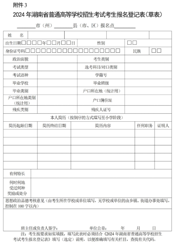 3.《2024年湖南省普通高等学校招生考试考生报名登记表》(草表)