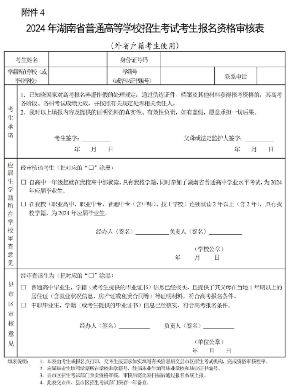 4.《2024年湖南省普通高等学校招生考试考生报名资格审核表》(外省户籍考生使用)