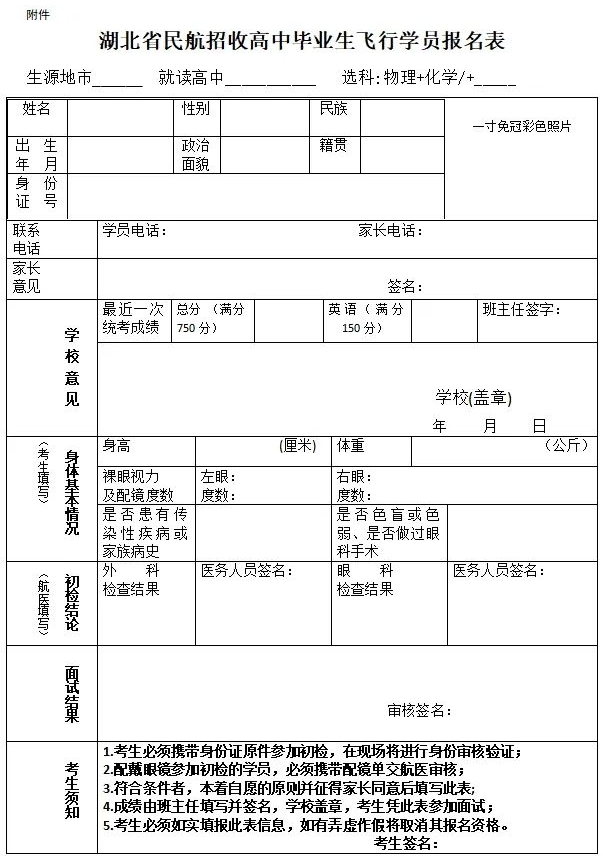 附件:《湖北省民航招收高中毕业生飞行学员报名表》