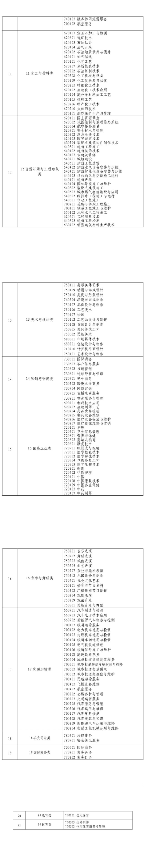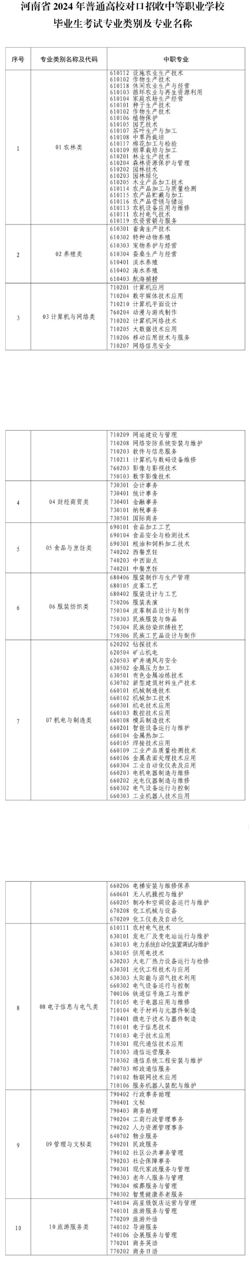 河南省 2024 年普通高校对口招收中等职业学校毕业生考试专业类别及专业名称