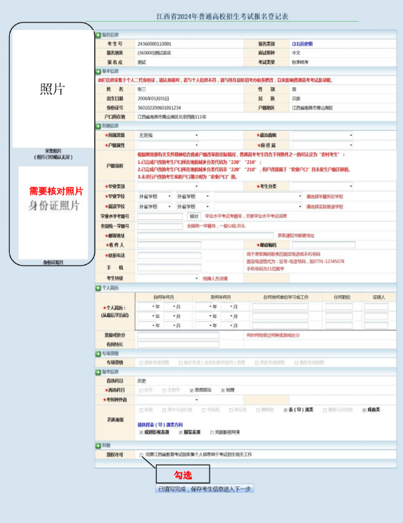 (3)在网上按照《江西省 2024 年普通高考报名登记表》及说明(以下简称“报名登记表”)如实填写报名信息。报名登记表将作为高校录取依据的电子档案材料之一,不得漏填和虚假填报,否则后果自负。没有上网条件的考生可到报名点进行网上报名。每位考生还须如实准确地填写各项信息,避免错填更不得虚假填报,填报完毕后要反复核对。前面已经提到新生入学资格审核会越来越严格,不要因为存在虚假信息而被退学。