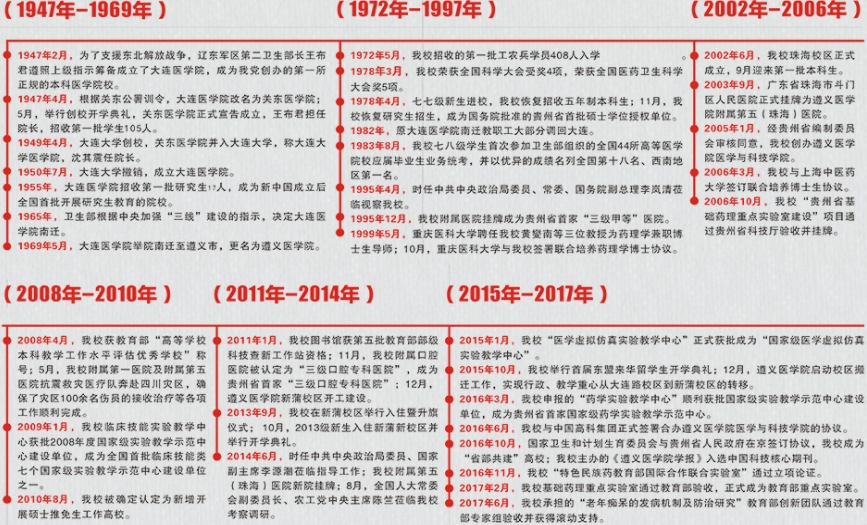 遵义医科大学的前身是创建于1947年的大连医学院,是抗日战争胜利后中国共产党创办的第一所医学本科院校。1969年为支援“三线”建设,整体南迁贵州省遵义市并更名为遵义医学院。2018年更名为遵义医科大学,2021年获批博士学位授予单位。