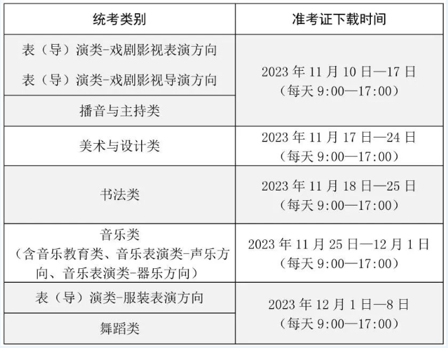 艺术类专业统考准考证由考生本人自行网上下载。符合上海市高考报名资格、已在网上报名参加本市艺术类专业统考并完成网上付费的考生须登录“上海招考热线”网站(www.shmeea.edu.cn),点击页面下方的“考试报名”栏目进入,下载并打印本人艺术类专业统考准考证,各统考类别下载时间安排如下: