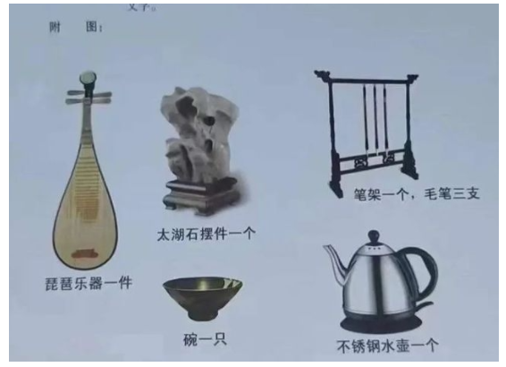 琵琶乐器一件、太湖石摆件一个、笔架一个、毛笔三支、碗一只、不锈钢水壶一个