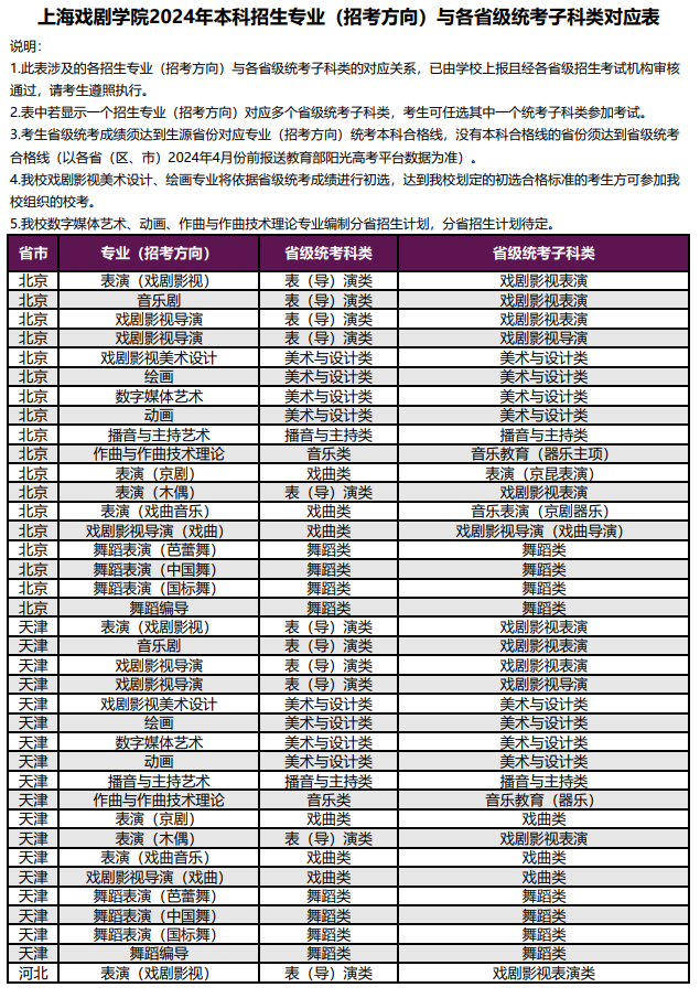 上海戏剧学院2024年本科招生专业(招考方向)与各省级统考子科类对应表.pdf点击查看