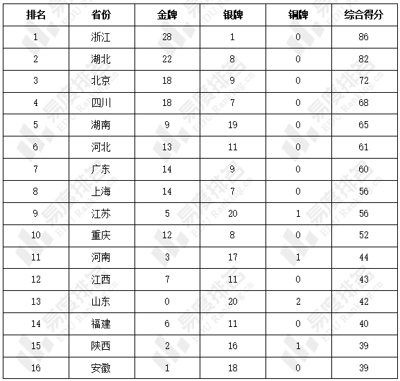 下表展示了各省市在2023年中学生物理竞赛决赛获奖情况。综合得分的计分方式为金牌记3分,银牌记2分,铜牌记1分,以综合得分从高到低进行排名。浙江省在此次物理竞赛中共获得28枚金牌、1枚银牌,浙江省物理竞赛水平已连续三年全国第一。