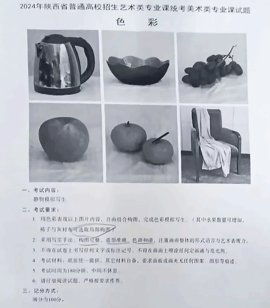 考试题目:静物组合模拟写生,包含一个不锈钢水壶,果盘,一串葡萄,一个西红柿,两个橘子,一个单人沙发座椅上面披着一块布。